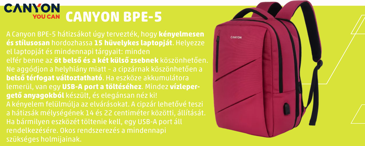 Válassza a CANYON CNS-BPE5BD1 Urban USB hátizsákot, és élvezze a kényelmet, biztonságot és modern megjelenést minden nap – akár munkába, iskolába vagy utazásra indul!