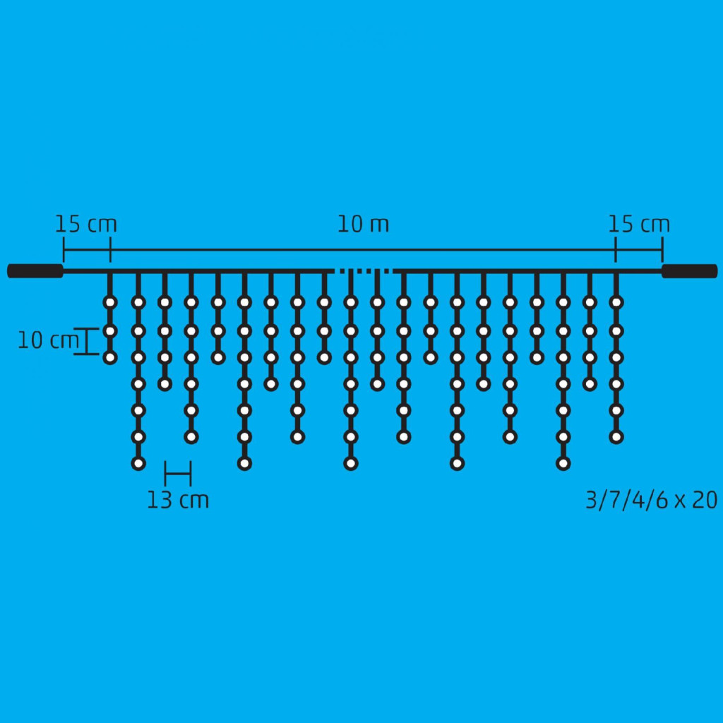 Ez a 10 méter hosszú fényfüggöny 400 hidegfehér LED-del rendelkezik, melyek ragyogó, állófényű világítást biztosítanak. A fehér vezeték diszkréten simul a környezetbe, így a figyelem teljes mértékben a tiszta, ragyogó fényekre irányul. A 3/7/4/6 elosztásban kialakított füzérek 20 csoportban oszlanak el, így biztosítva a fények egyenletes eloszlását, miközben a sorolható kialakítás lehetővé teszi, hogy több DLI, DLF vagy DLFJ terméket összekapcsoljon, és lenyűgöző fényhatásokat hozzon létre.