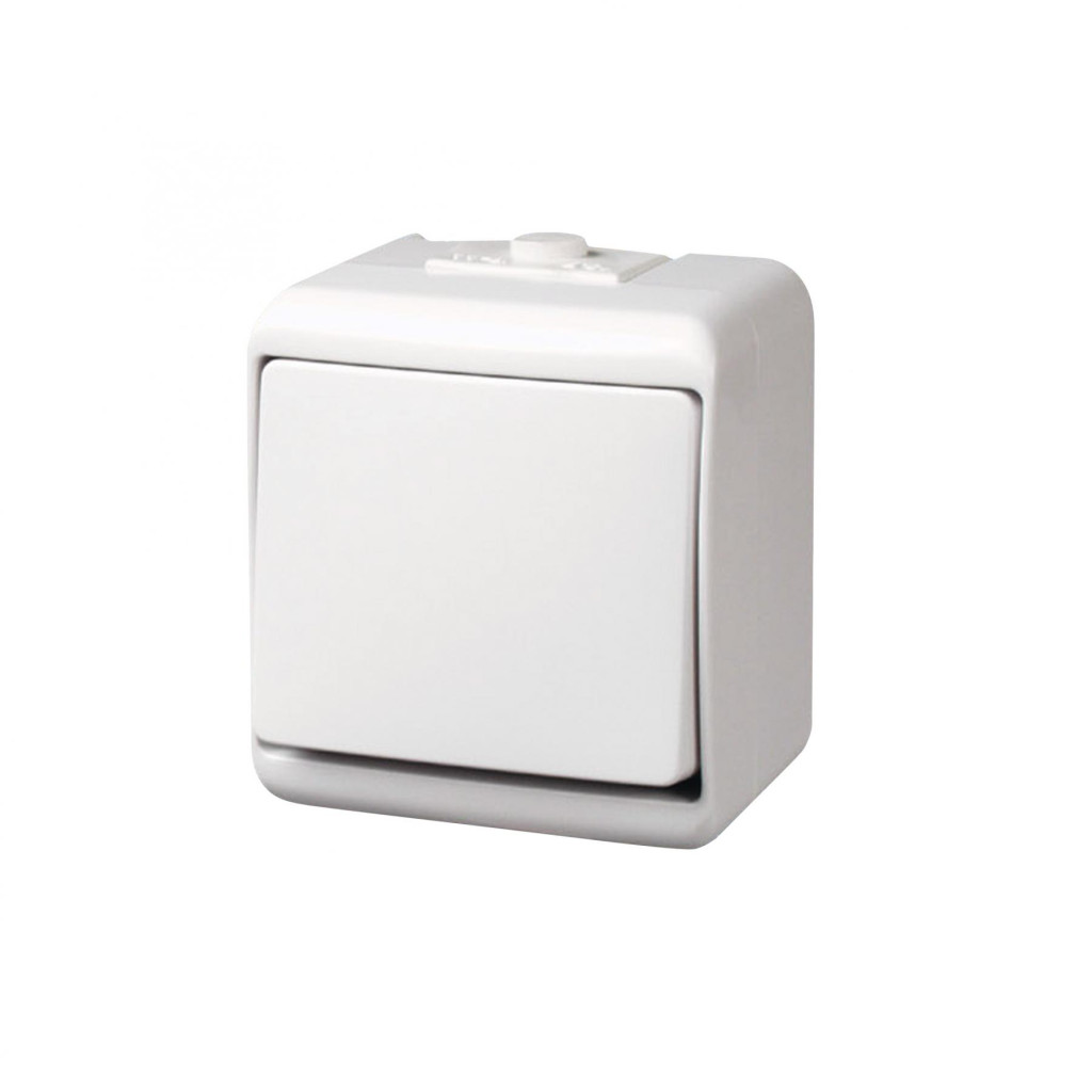 Ez a falon kívüli kapcsoló IP44 védettségi fokozattal rendelkezik, amely garantálja a védelmet a fröccsenő víz és por ellen, így ideális kültéri használatra.
