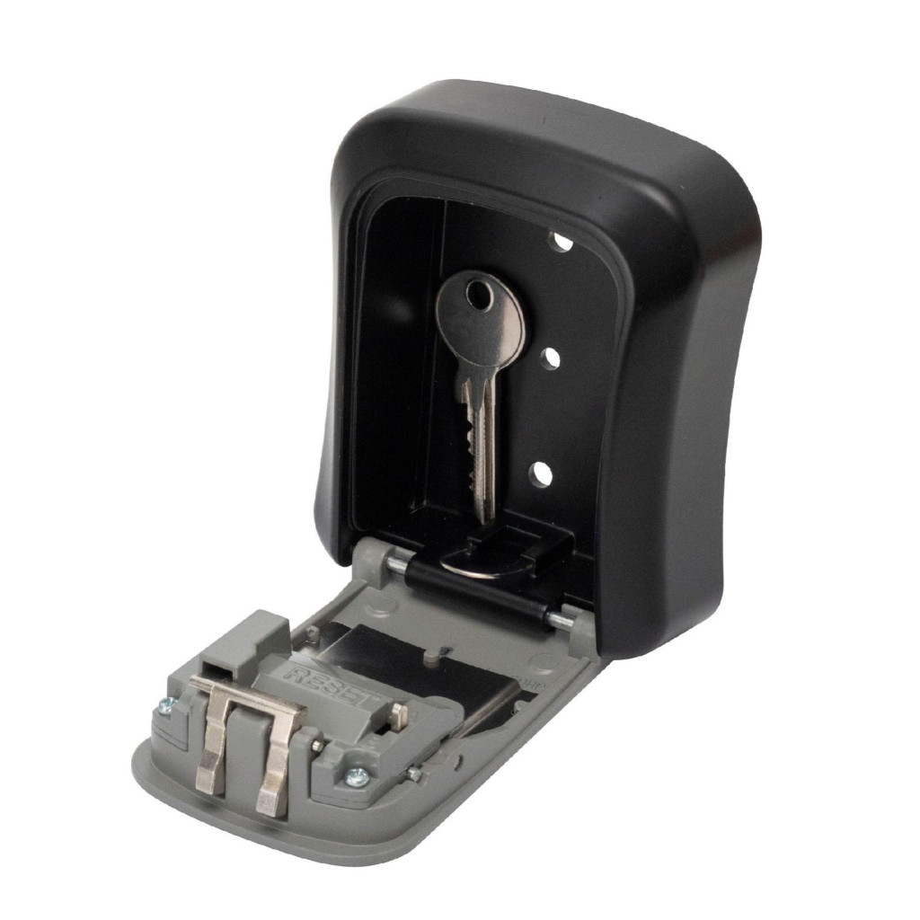 A kulcsszéf elcsúsztatható porvédő fedéllel rendelkezik, amely védi a számzárat a portól, esőtől és szennyeződésektől, így megbízhatóan működik kültéren is. A hátoldalán található 4+1 furat segítségével egyszerűen falra rögzíthető – a szükséges csavarokat és dübeleket a csomag tartalmazza.