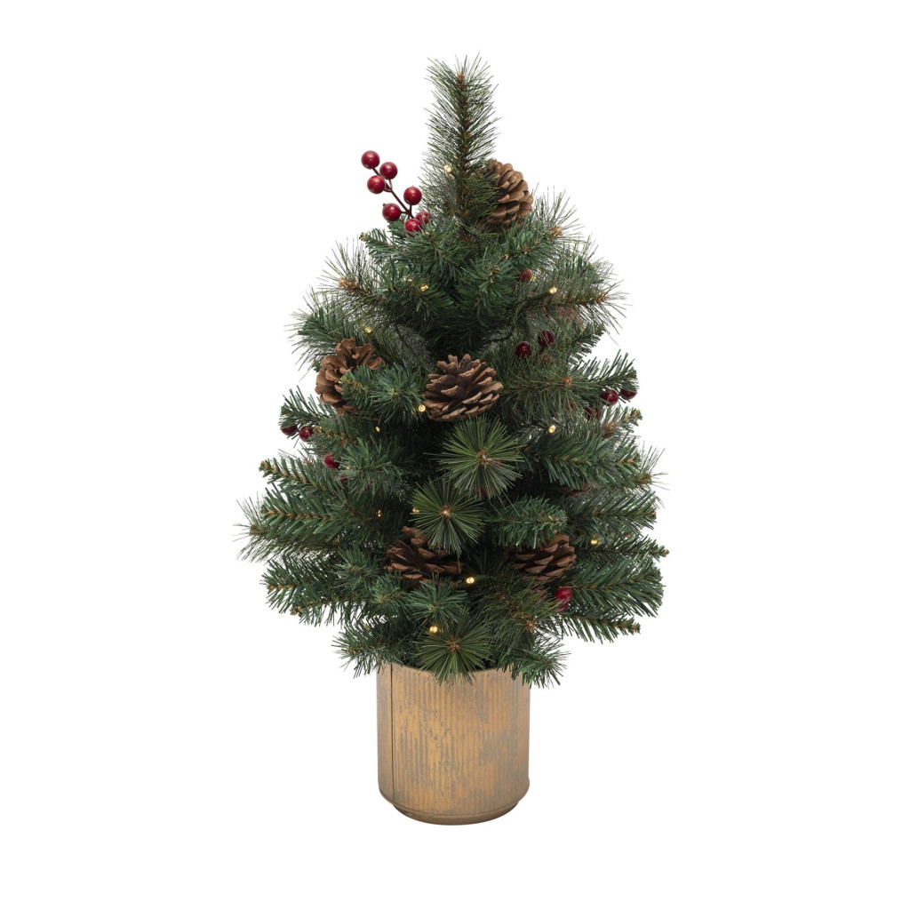 A fenyőágak 2D tűlevelekkel készültek, élethű megjelenést kölcsönözve a dekorációnak. A beépített toboz és vörösáfonya díszítés rusztikus hangulatot teremt, így a fa önmagában is komplett díszítőelemként funkcionál.