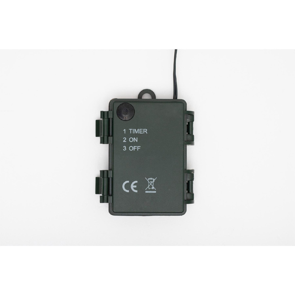 A fenyőt 30 db melegfehér LED világítja meg. Az 8 programos kültéri elemtartó lehetővé teszi a fényhatások közötti váltást – nyugodt pislákoló fénytől a dinamikus villódzásig. A működéshez 3 db AAA elem szükséges (nem tartozék), így a műfenyő teljesen mobil, nem igényel konnektort.