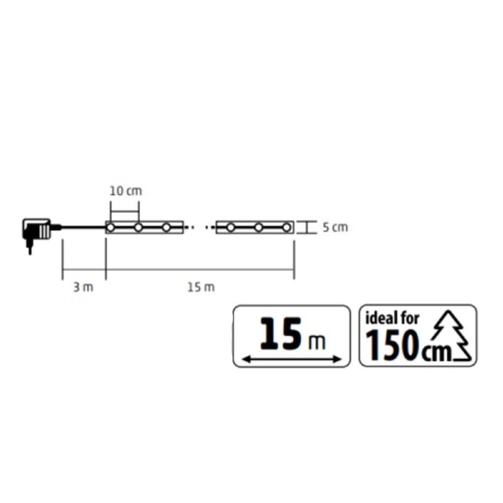 A fényfüzér 15 méter hosszúságú, 5 cm széles ezüst szalagot kínál, amely egyaránt alkalmas polcokra, ablakkeretekre, kandallópárkányokra vagy akár asztali dekorációként is. A LED-ek 10 cm-enkénti elhelyezése biztosítja az egyenletes fényeloszlást, így minden részlet megkapja a megfelelő kiemelést.